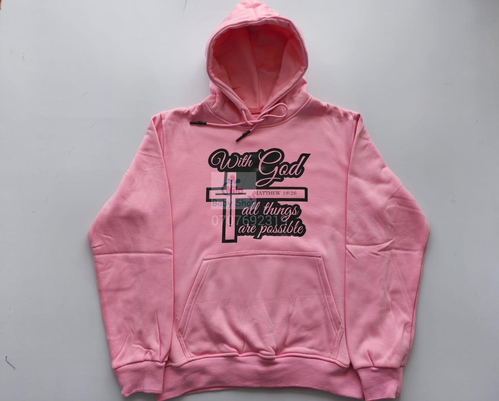 Custom Branded Pink Hoodie - With God all things are possibleCustom Branded Pink Hoodie – With God all things are possible